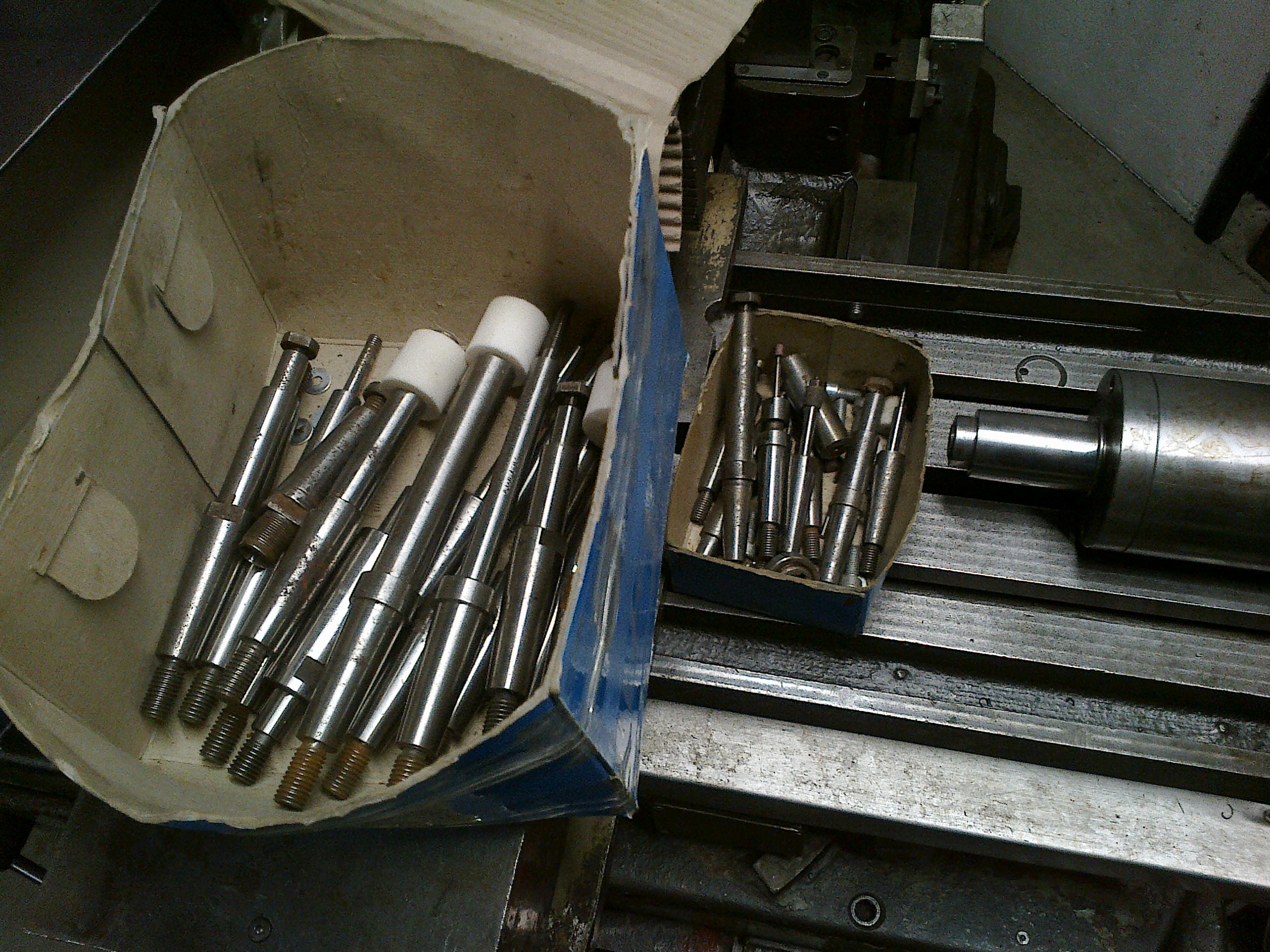 Starý vřetena z strakonic mají kužel, nový jsou válcový - a pak jsou k tomu opět odpovídající trny - starý s kuželem, nový válcový. Tohle je nový vřeteno a starý nástavce.