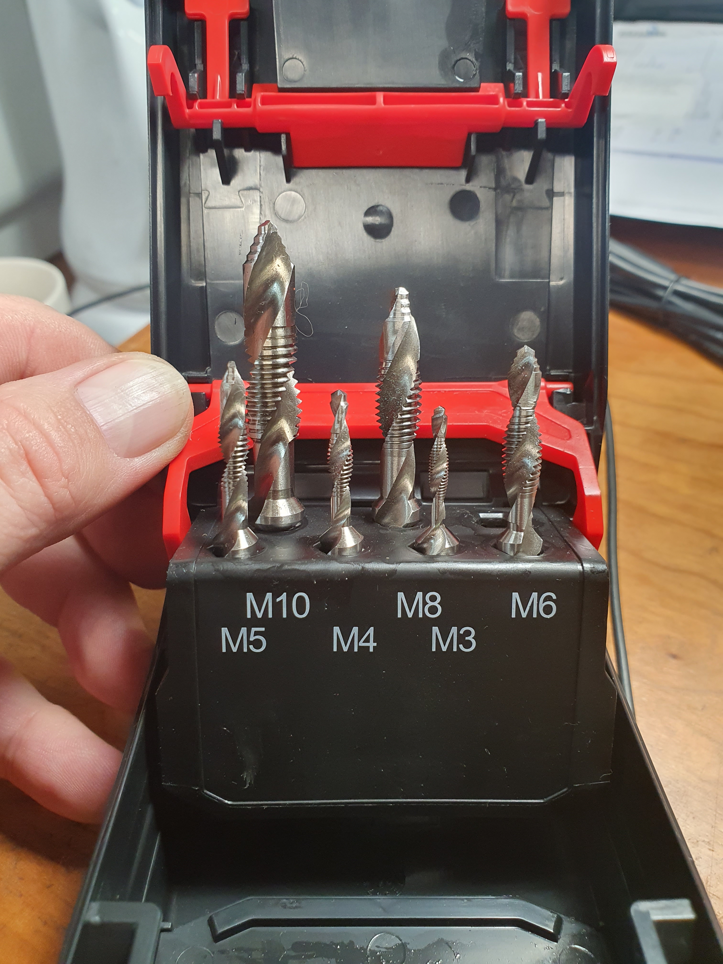 závitová fréza "3 v 1" dole to má vrták, uprostřed závitovou frézu a nahoře sražeč hrany