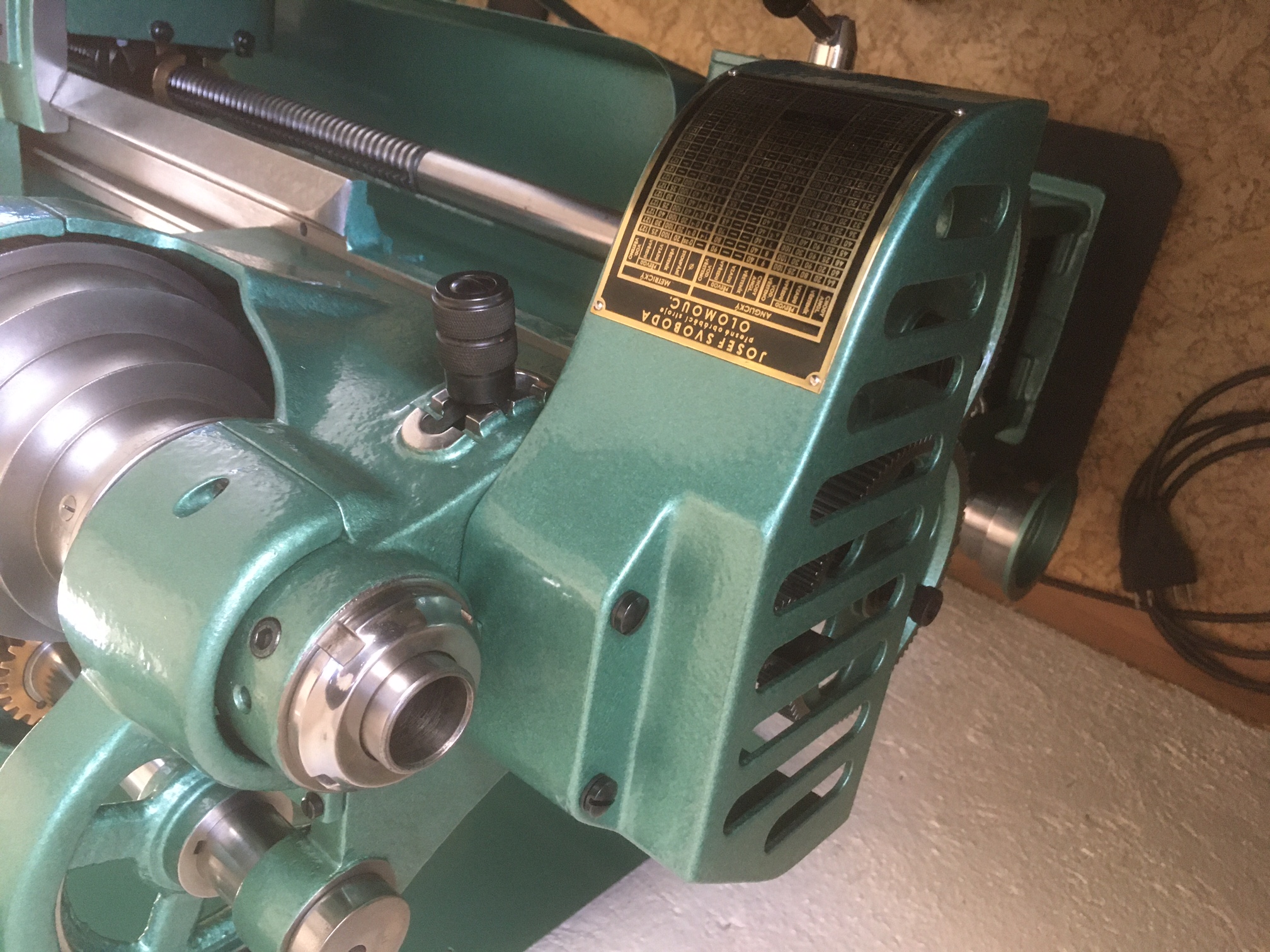 na svůj soustruh. Štítky jsou vyrobené podle originálního vzoru, z mosazného plechu , klasickou metodou leptáním a potom vyleštěny a vyplněny černou barvou. Štítek s označením výrobce a tabulkou závitů se montoval, podle modelu soustruhu, buď na kryt výměných kol, zadní nohu soustruhu nebo na vřeteník a tři menší štítky patří na krabici s vypínačem ( přepínačem smyslu otáčení soustruhu) Obtisk je vodou přenositelný a je určený na dvířka soustruhu ( stejné logo bylo též na stolních vrtačkách JSO)