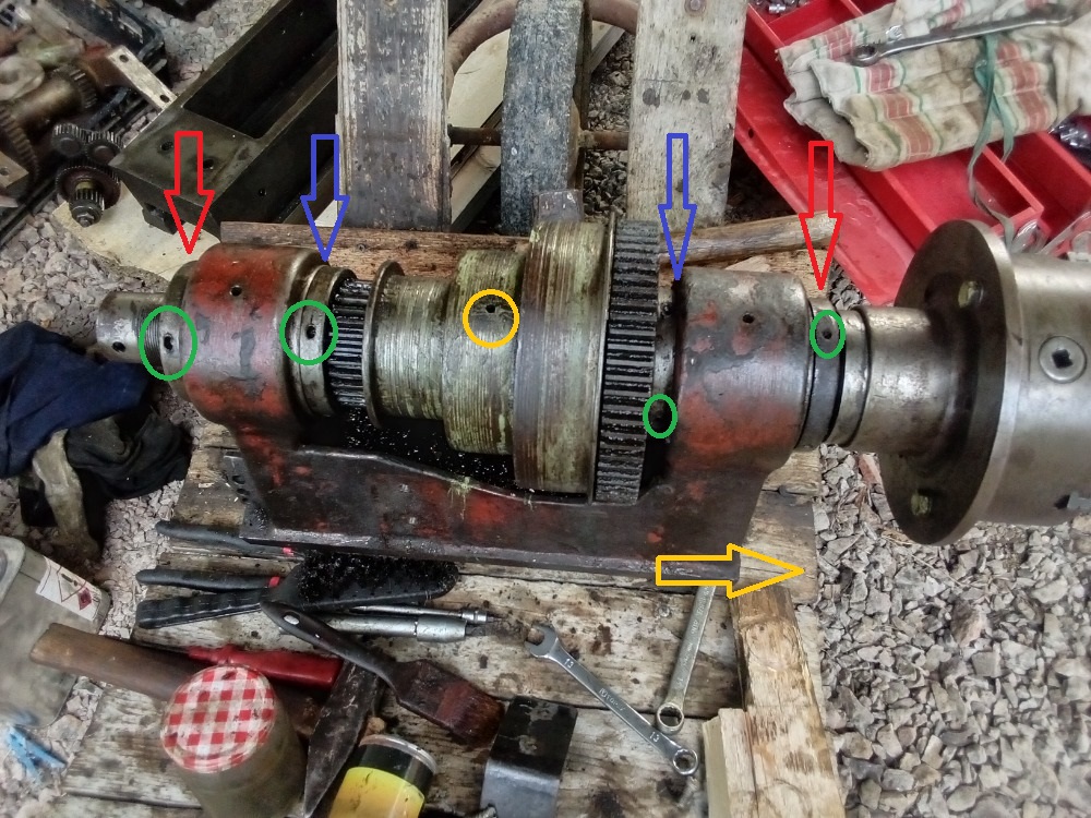 Jak je videt na obrazku s sipkami, matice staci povolit a vreteno opatrne vytahnout ven. Jedine matice, ktere vysroubujes ven, jsou na vymezeni axialni vule. Ale vypada to, ze uz jsou pryc.