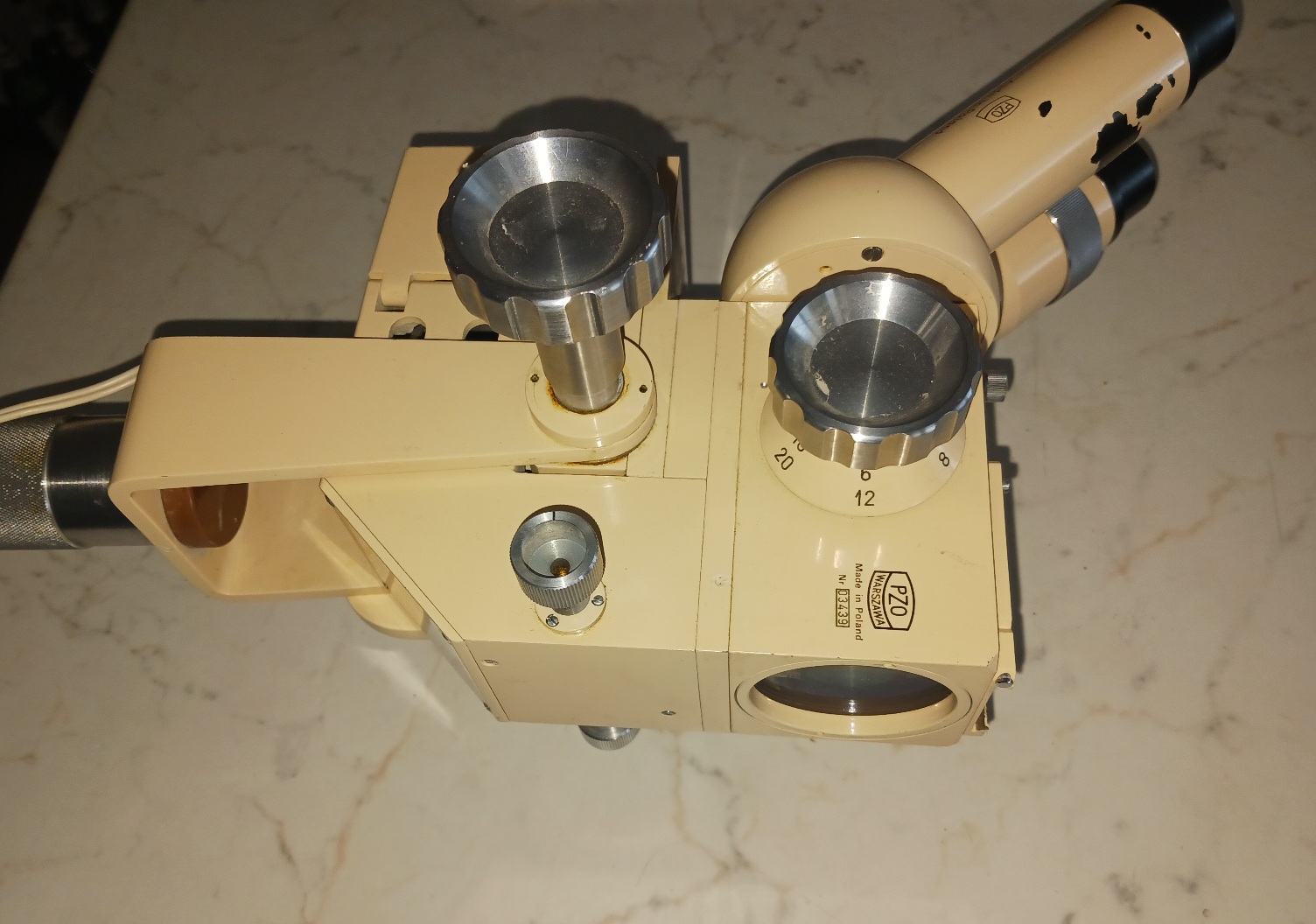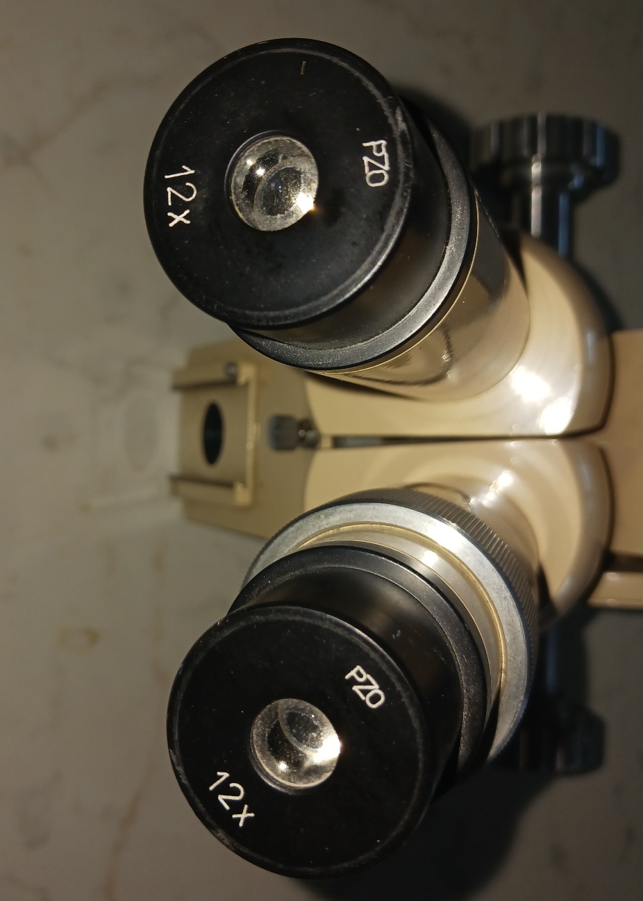 Operační mikroskop. Přepínání zvětšení 4 až 50 záleží na objektivu. Schází žárovka jinak ok.