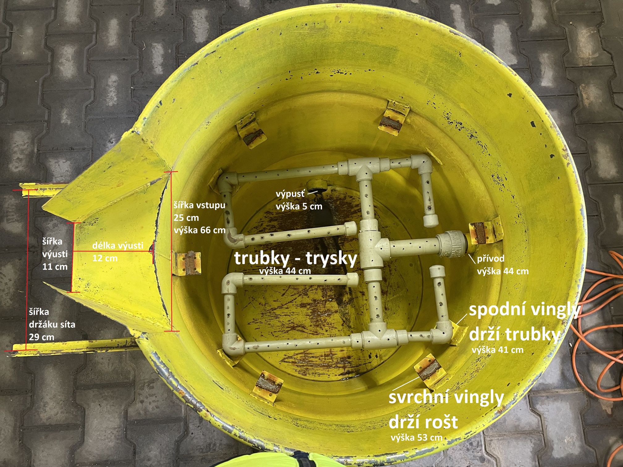 1) úpravy sudu – otevřený vršek, vyvrtání otvoru a přivaření přívodu vody a vypouštěcího kohoutu. Na vnitřní straně přivaření vinglů ve dvou úrovních: spodnější pro uchycení a podporu trysek po obvodu a svrchní pro uchycení roštu na podporu síťoviny. Při vrchním okraji vyříznutí otvoru pro navaření přepadového korýtka. Z vnější strany přivaření L profilů coby držáku na síto. 2) Rošt pro podporu síťoviny. 3) Systém trysek z plastových trubek.