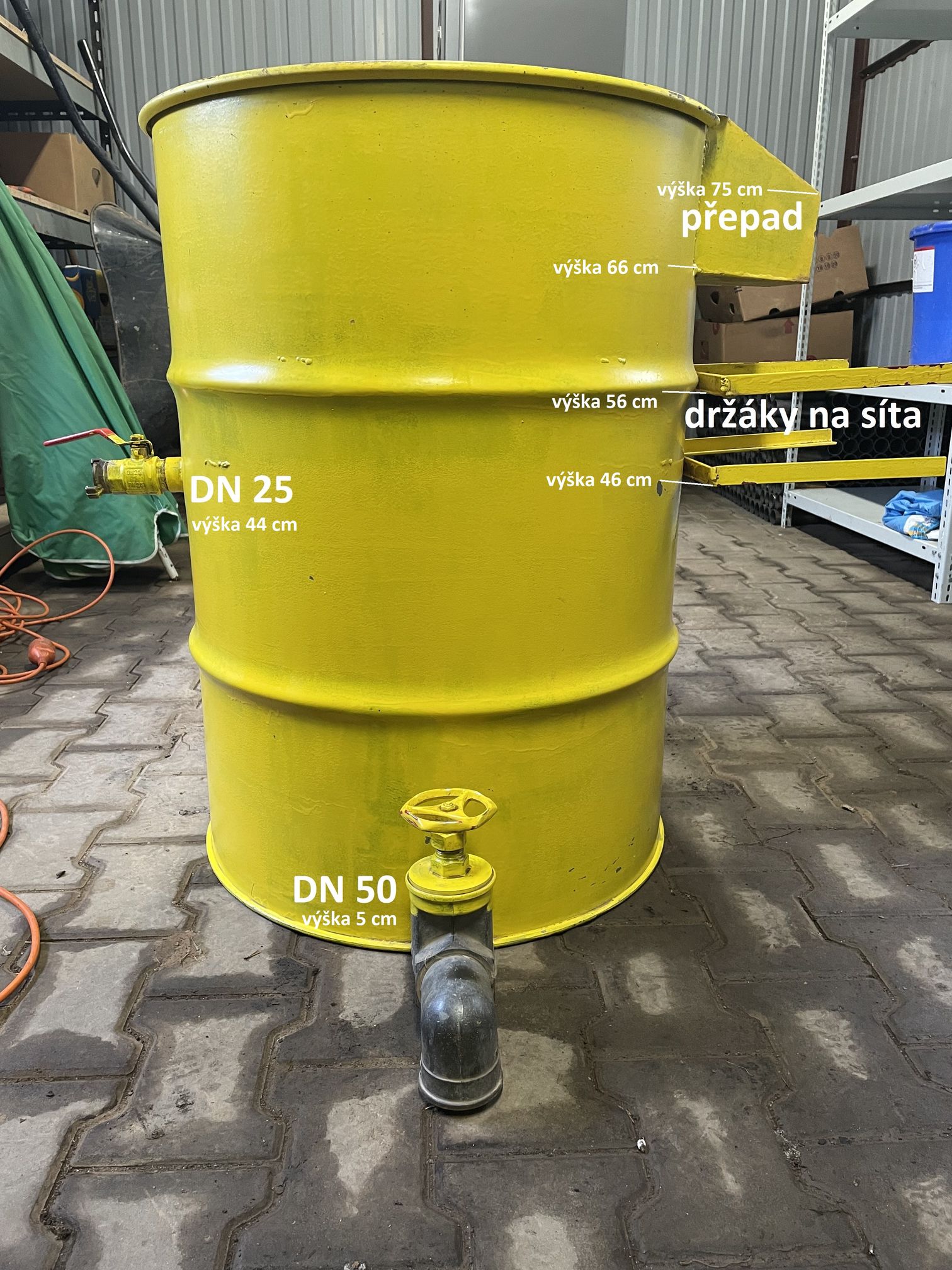 Parametry: sud: cca 200 l, cca 80 cm výška, cca 60 cm průměr. Přívod vody pákový kohout DN25, vypouštěcí kohout DN50