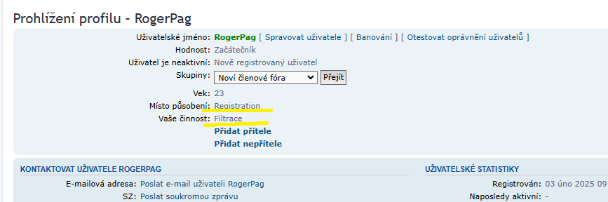 pravidelně několikrát týdně je tu jeden co má vyplněný věk patrně ročníkem narození tedy těch 98, místo působení Residence, obor Filtration, mailovku někde na yaho nebo co a skoro vždycky je ip registrovaná v rusku a v některé kolonce k vyplnění je url .ru