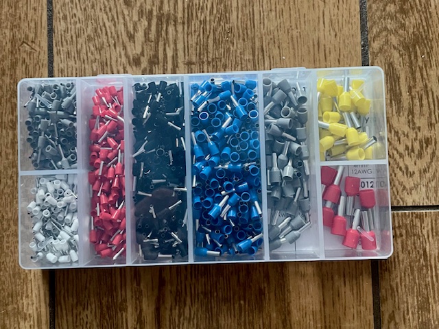 Lisovací dutinky na lankové vodiče v plastovém boxu.