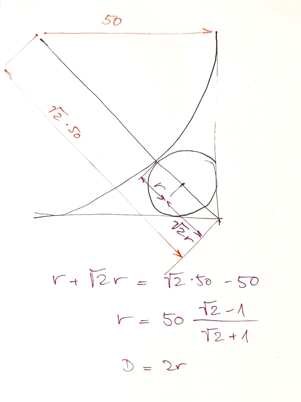 Ano, postupoval jsem úplně stejně, a nakonec jsem se to snažil upravit do co nejjednodušší formy, aniž bych se dopustil explicitního vyčíslení odmocnin, a taky jsem chtěl, aby tam stále figurovala původní hodnota průměru 100.