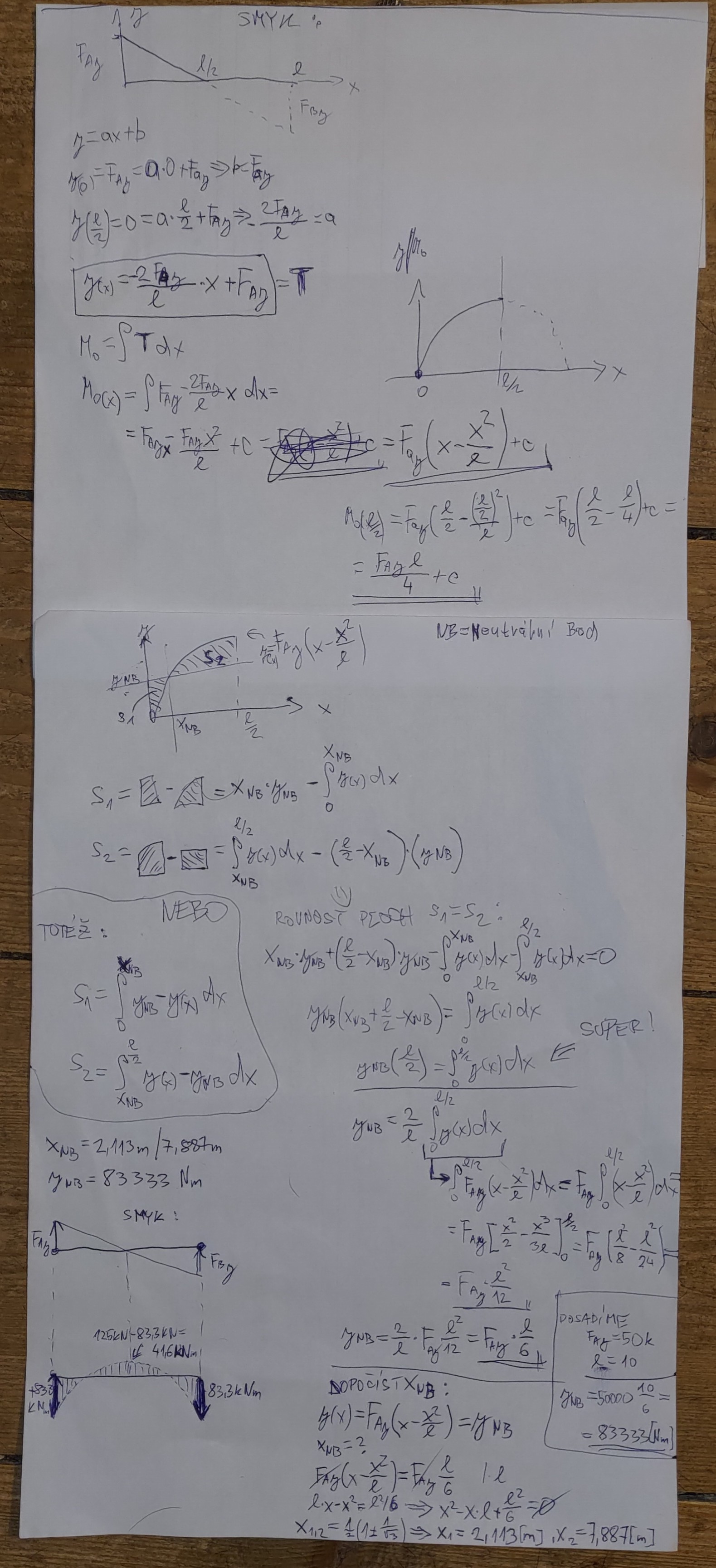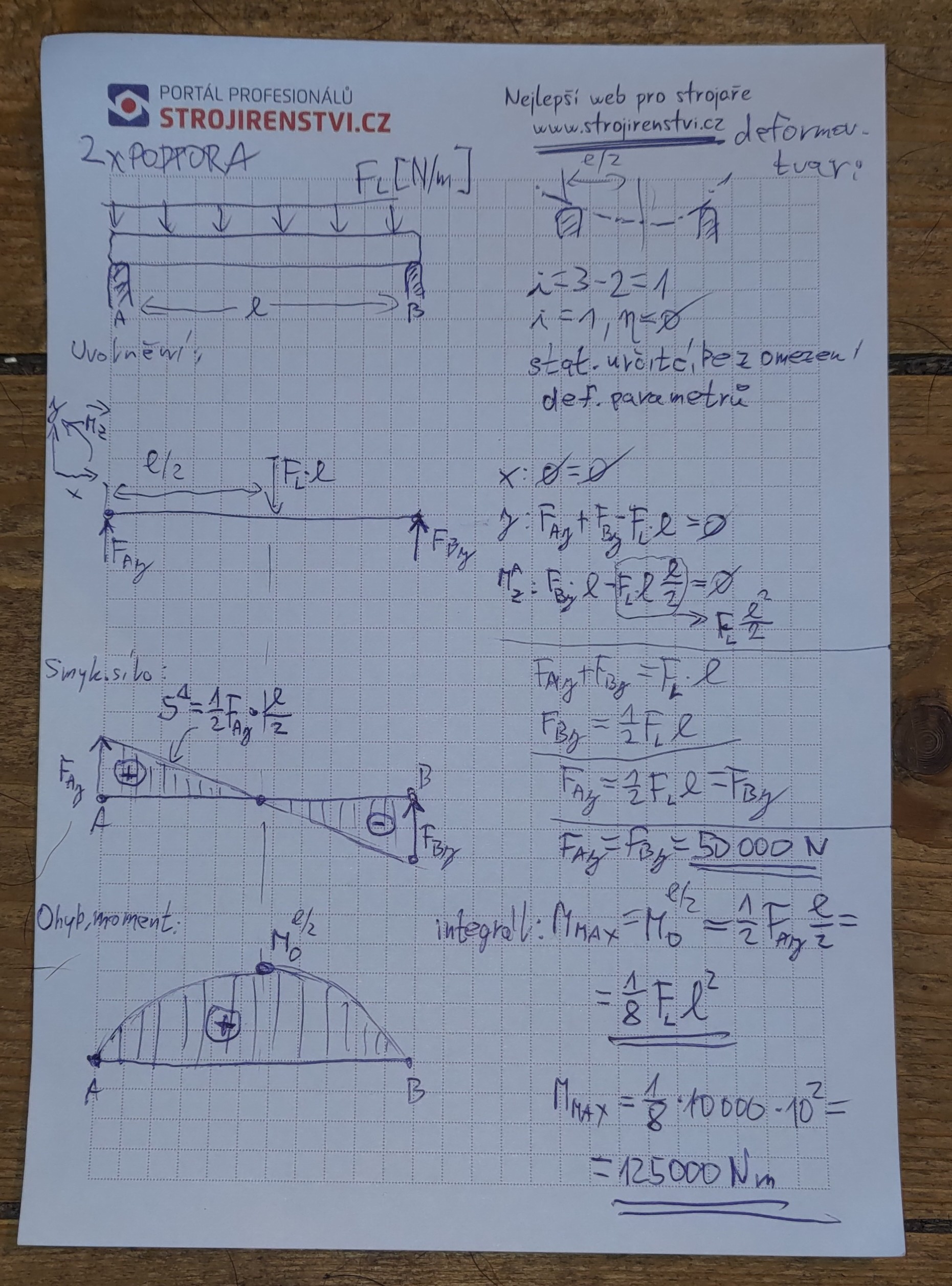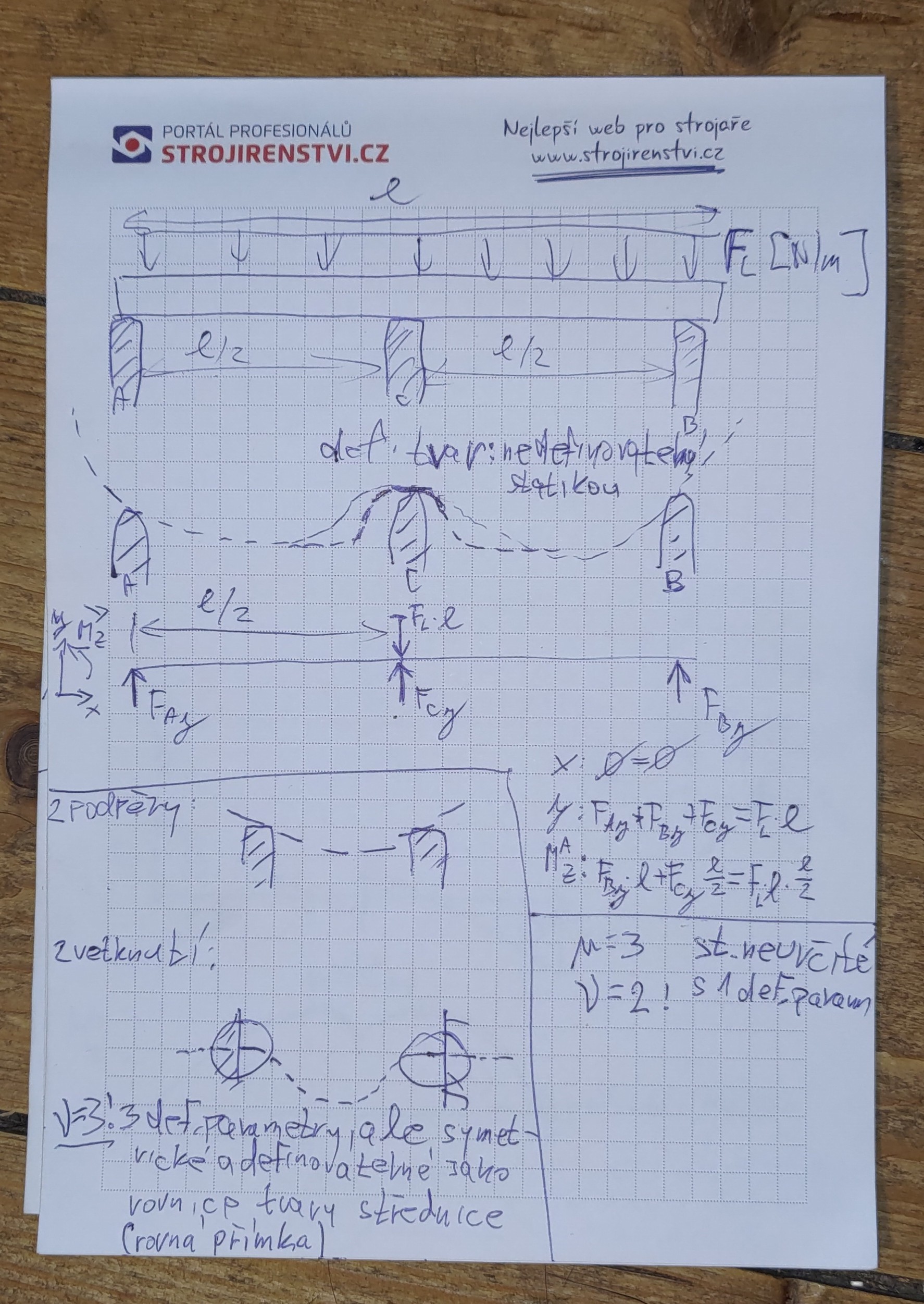 K nemu je jeste treba dopocitat moment, protoze vazby momentove pusobi, ale staticke rovnice nestaci k urceni hodnot reakcnich momentu. Z nekolika zpusobu jsem rozepsal ten ciste matematicko-geometricky, ke kteremu neni treba znat dalsi mechanicke "figle". Princip je nulova suma ohyboveho momentu nosniku: