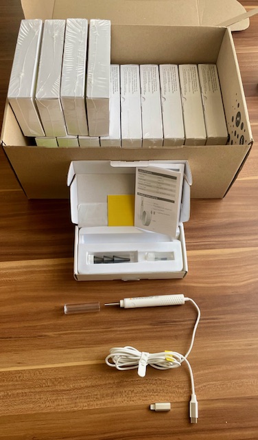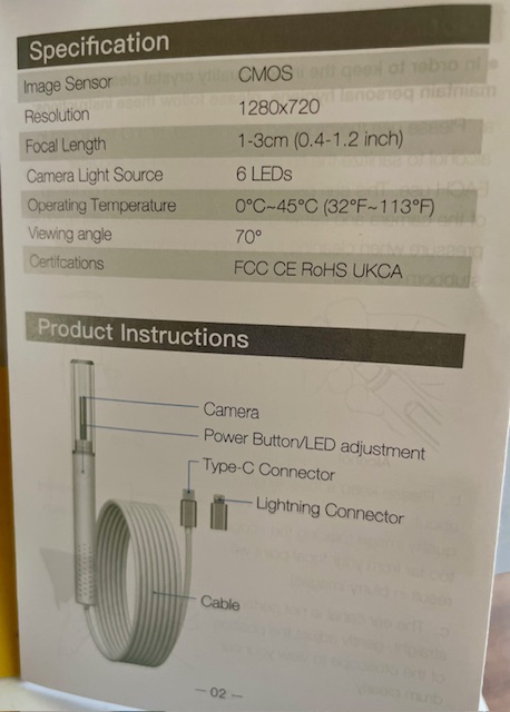Jako další věc tady mám krabici tužkových mikrokamer s objektivem v trubičce o průměru 3,9mm včetně přisvětlovacích LED diod. Specifikace viz.foto Připojení přes USB-C. Součástí i redukce pro iPhone USB-C / lighting.