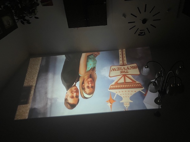 rovnou bílou zeď na kterou by se dalo promítat - fotky jsou tedy foceny z promítání o strop a z úhlu projektorem drženým v ruce s tím, že jsem neřešil srovnání obrazu pouze zaostření...