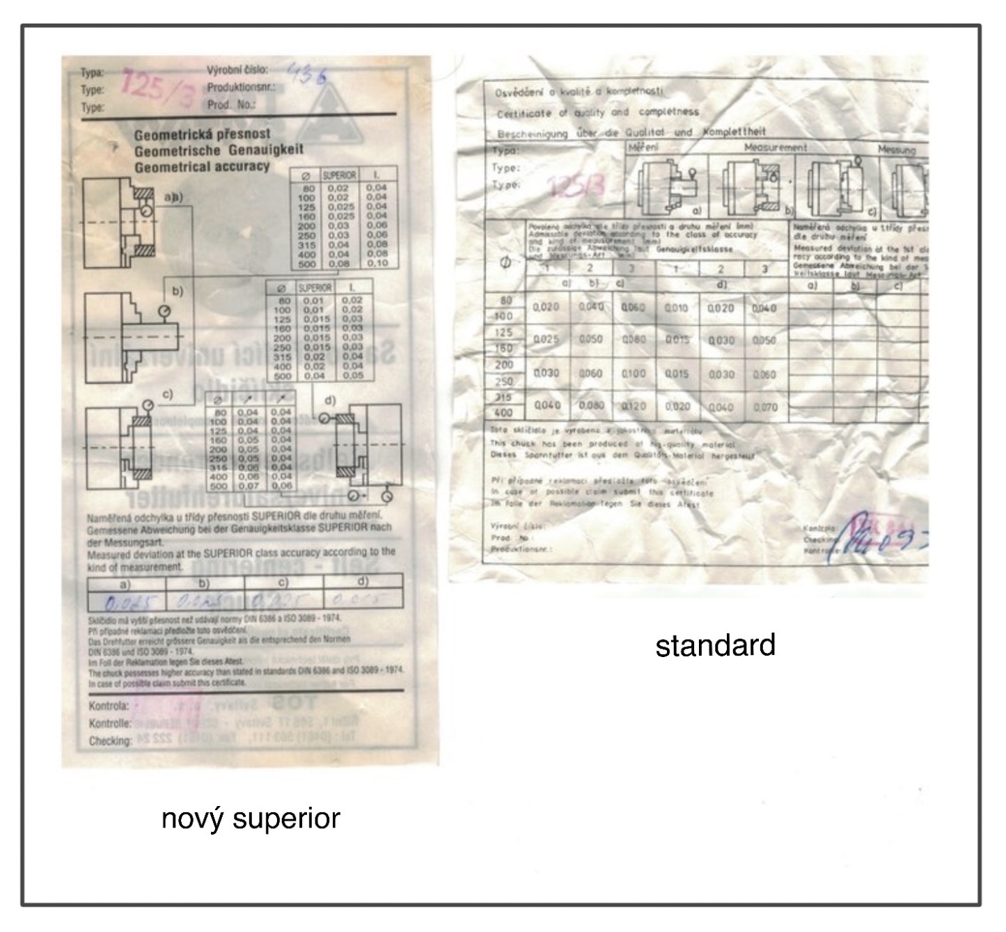 Začneme u měřícího protokolu. Má ho každý, kdo si koupil sklíčidlo od nich. Nových tosek mám několik a níže je porovnání starého a nového měřícího protokolu. Tuzemský výrobce má dvojí kvalitu sklíčidel. Standardní a Superior. Přesnost standard odpovídá tolerancím v tabulce. Kusy s lepší přesností navíc mají vyplněný zvýrazněný řádek dole - je to reálná zjištěná přesnost.