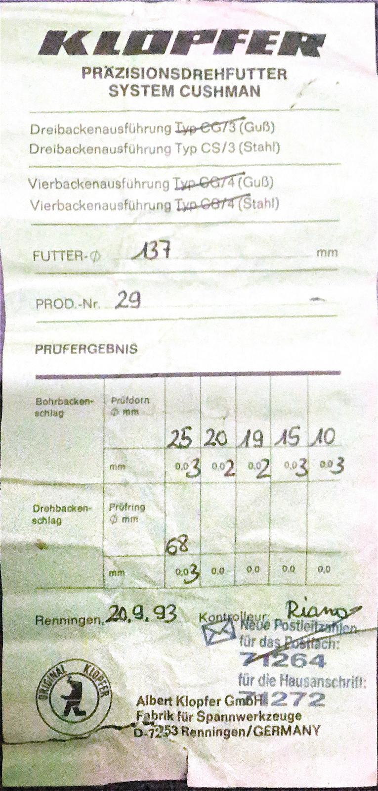 A tady je naskenovaný dokument k německému sklíčidlu Klopfer. Koupil jsem ho jako nepoužitý skladový kus. Je to ocelové sklíčidlo s integrovaným uchycením DIN 55027/5. Vidíte, že naměřené hodnoty jsou podobné jako u našeho Superior. Také si všimněte, že házení zkouší na měřících trnech různých průměrů. To je dobré si zapamatovat.