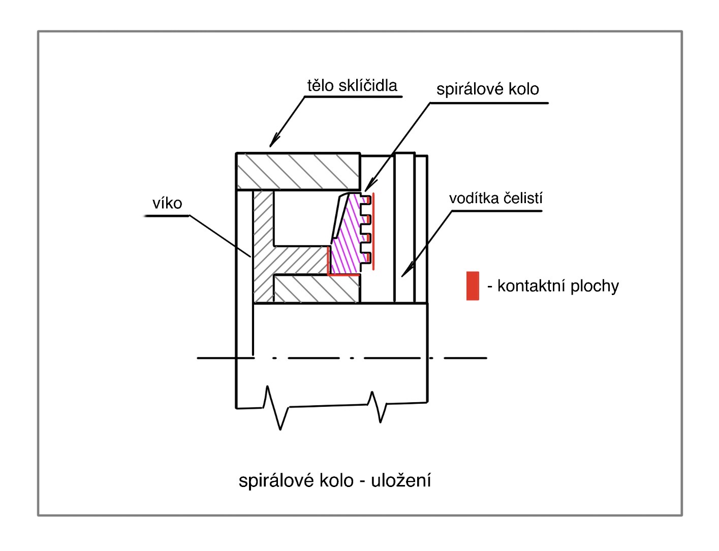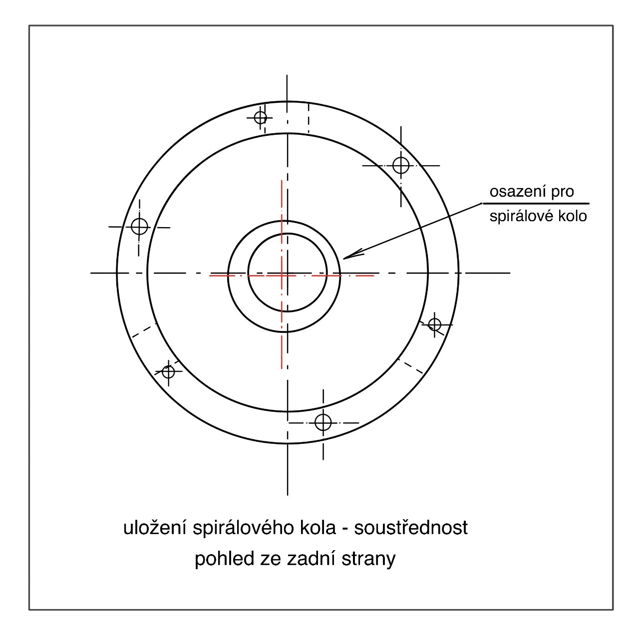 Další danost, která ovlivňuje přesnost (kromě samotné výroby kola) je přesnost uložení spirálového kola mezi různé části sklíčidla. Na obrázku zvýrazněné červeně. Kolo musí zapadat velmi přesně jak v axiálním, tak radiálním směru. Proto v tomhle moc nedůvěřuji českým sklíčidlům, které mají plastové zadní víko = je to dosedací plocha spirálového kola. Jiní výrobci (Rohm, Forkardt, Klopfer a další) mají to víko litinové nebo ocelové a broušené z vnitřní strany. A zřejmě k tomu mají důvod.