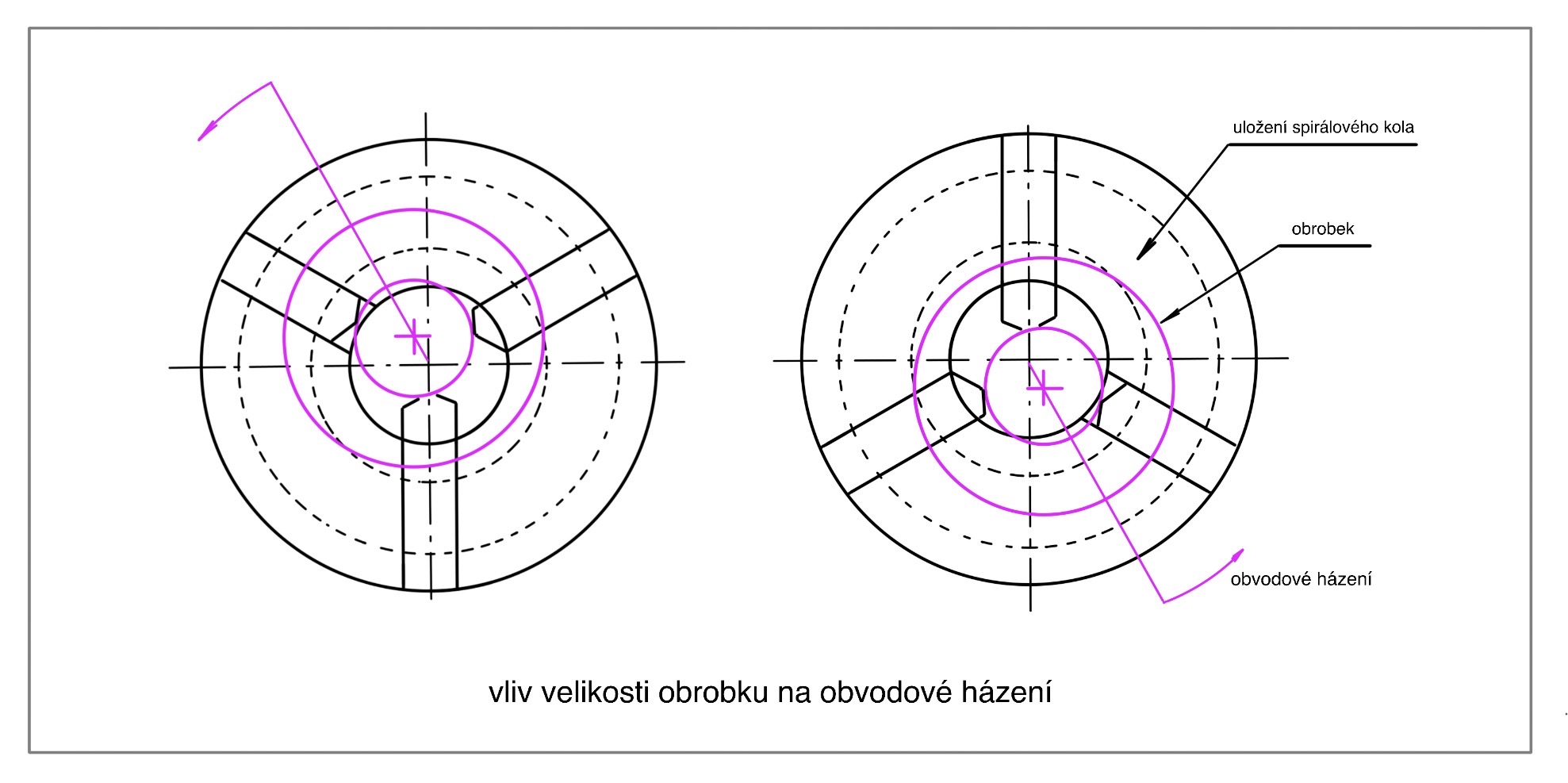 Příklad - spirálové kolo je 0.2 mm mimo střed, přebrousím čelisti na nulu pro průměr 20mm a ten opakovaně upínám přesně. Stačí ale upnout jiný průměr kdy se spirálové kolo otočí o 180st a jsem 0,4mm mimo střed. To je ten problém čínských sklíčidel.