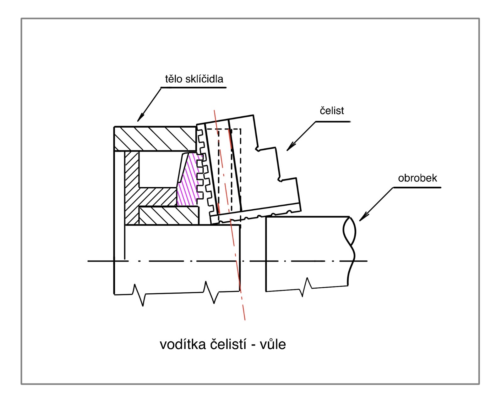 Vůle z výroby nebo vzniklá provozem. Každopádně způsobuje u krátkých obrobků vychýlení čelistí a tím nedostatečný kontakt s obrobkem. Znázornění je silně přehnané, ale i malá vůle v setinách může znemožnit upnutí krátkých věcí. Takhle jsem se spálil s čínskou “stovkou”. Vůle ve vedení byly tak velké, že nešlo chytit rozumně nic kratšího, než polovina délky čelisti. To sklíčidlo jsem vhodil do popelnice na kovy, kam díky svému tvaru skvěle zapadlo. Tohle se týká i nesoustředných sklíčidel a také lícních desek.