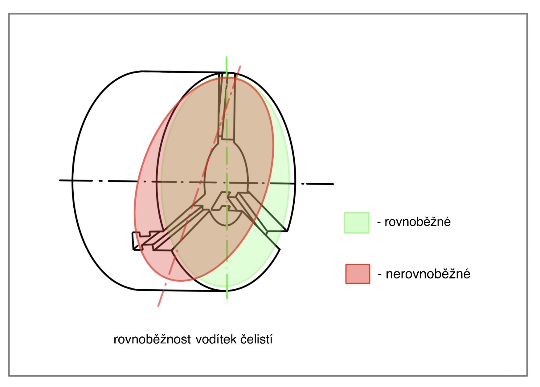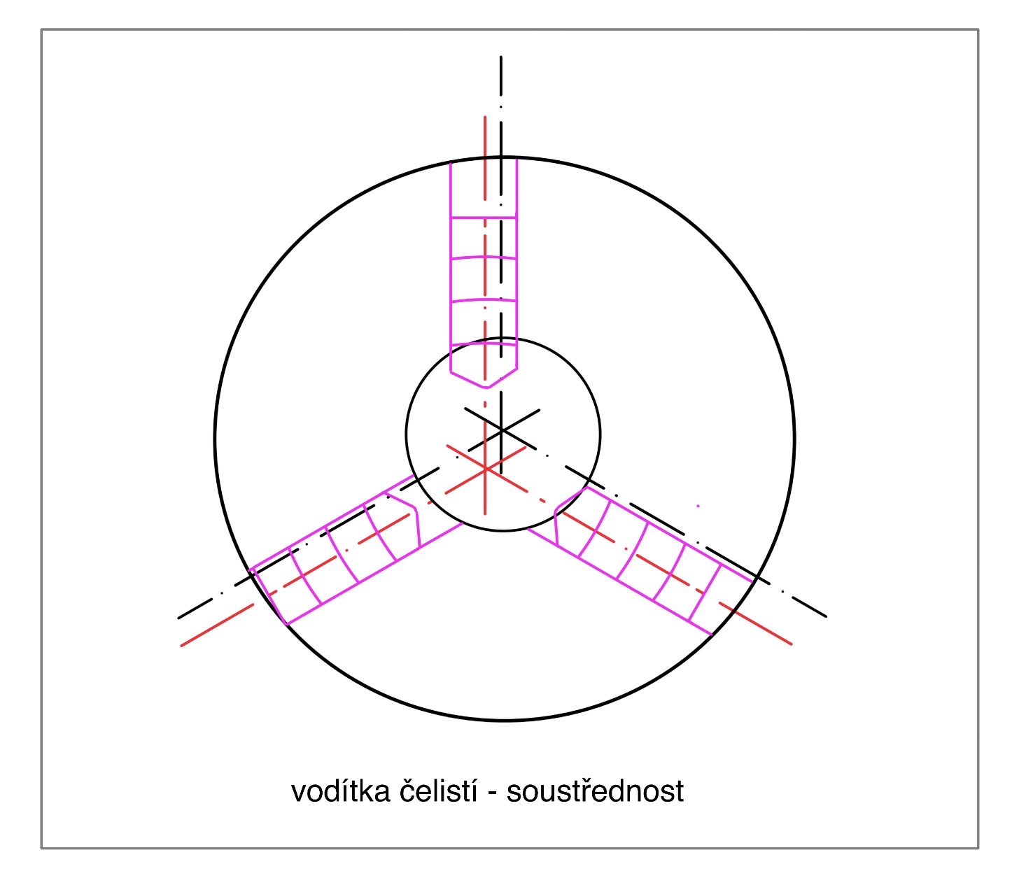 soustřednost vedení čelistí - pokud nedoržíme 120st nemá vliv na přesnost, pokud není dodržena souosost tak je vliv relativně malý - ujetí jedné čelisti do boku o 1 mm mi při přenastavení na jiný průměr zanese chybu 0,02 - 0,03 mm
