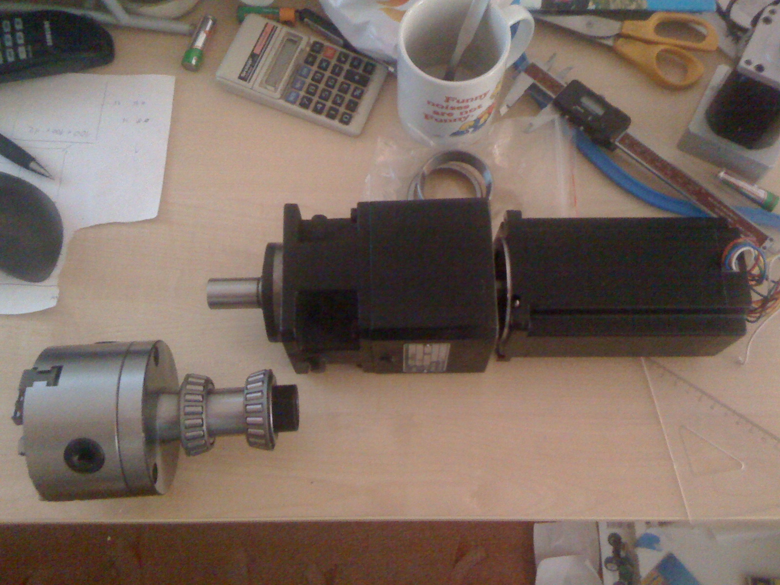 Potřeboval bych trochu poradit se 4-rotační osou. Nyní už mám doma všechny komponenty a už jen je sesadit, ale mám jediný problém, a to jak vyřešit spojení převodovky s přírubou sklíčidla. Jako nejjednodušší mi přišlo dát to vedle sebe viz. foto a nahánět to ozubeným řemenem, řemenice na přírubě sklíčidla by byla mezi ložisky. A zde je můj problém, šíře řemenice může být pouze 20mm, případně kdybych odsoustružil (pokud to vůbec pujde) ten konus co je na přírubě před prvním ložiskem, tak bych se dostal na šířku řemenice asi 30mm. Jaký je váš názor na pohon řemenem? vím že se to hodně používá, ale zde se bojím té malé šířky, bojím se aby to při obrábění nějak nepružilo, kdybych tam mohl dát šířku alespon 50mm tak to řešit nebudu , ale těch 20/30mm se mi zdá málo, možná se pletu a bude to dobrý. řenenice by měla pr. cca60-70mm, oboje stejné (1:1) a byly by co nejblíže u sebe, takže volný řemen ve vzduchu by byl asi 70-80mm .