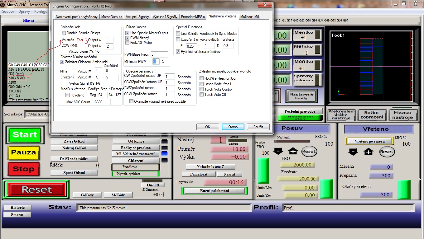 Pokud jsem to pochopil, tak v motorech je třeba nastavit motor 5 jako spindle a dát mu 1 krok, max otáčky a nějaké to zrychlení. Já mám 1/4060/500. Ve Spindle v Machu dál max otáčky rozsah 0-4060ot a pak začnu konfigurovat PWM. To jsem měl udělat tak, že pro S2030, tedy 50% otáčky by mělo výstupní napětí jít 5V. Pro 4060ot pak 10V. Na měniči jsem dal rozsah 0-10V (bylo 0-5V s vestavěným potenciometrem) a jakož takož to jede. Zkoušel jsem různé kmitočty na PWM, ale je to stejné jako pro 5h tak i pro 500Hz. Porstě mi z toho leze vyšší napětí. Jakmile se sepne vřeteno, mám na PWM 2,3V navíc a ještě to kolísá. Kdybych aktivoval stabilizaci otáček před zahájením Feedu, tak se mi mašina nerozjeze ani s nastavením 80%, tedy kolísání je vyšší než 20% Minimální otáčky mám ne 10Hz (580ot), jak je nastaveno na měniči (s potenciometrem na měniči funguje správně). Prostě je to na prd.