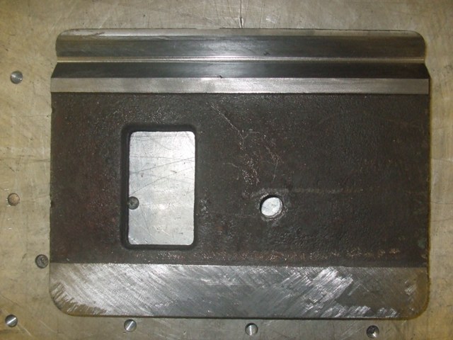 Pak následovala deska koníku. Ten kdo dělal "generálku" přede mnou, byl děsný prase. Asi se mu nechtělo zaškarbávat celou plochu, tak prostě prostředek vodicích ploch vysekal do lavoru a zaškarbal jenom konce. Musel jsem to odfrézovat o 0,6mm (měřeno v ose Z) abych se dostal na čistý kov. Tentokrát jsem nebrousil. Ofrézoval jsem to planárem s kulovkou o průměru 8mm a s řádkováním 0,3mm. Pak jsem to doškrabal. Sedí perfektně a jezdí to nádherně :-) Po usazení na lože jsem přefrézoval a hrubě zaškrabal i horní plochu desky.