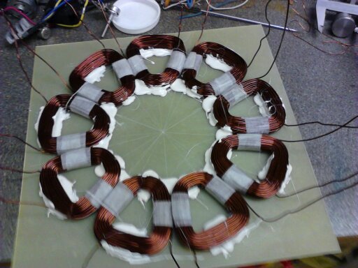 Důležté je však upozornit, že se závity se to nesmí přehánět - prvně jsme se také hnali za závity (a tím i vyšším napětím), ale není to ta nejlepší cesta - generátor má pak velmi malý výkon (je schopen dodat malý proud) díky velkému vnitřnímu odporu. To je případ generátorů, které jsou k vidění na youtube - i při malých otáčkách dávaj např. 110V, ale žárovku nerozsvítí. Je nutné najít kompromis mezi počtem závitů v cívce a sílou drátu. Někde na disku možná ještě vyhrabu program, kterým jsme hledali poměr, při kterém má generátor maximální výkon...