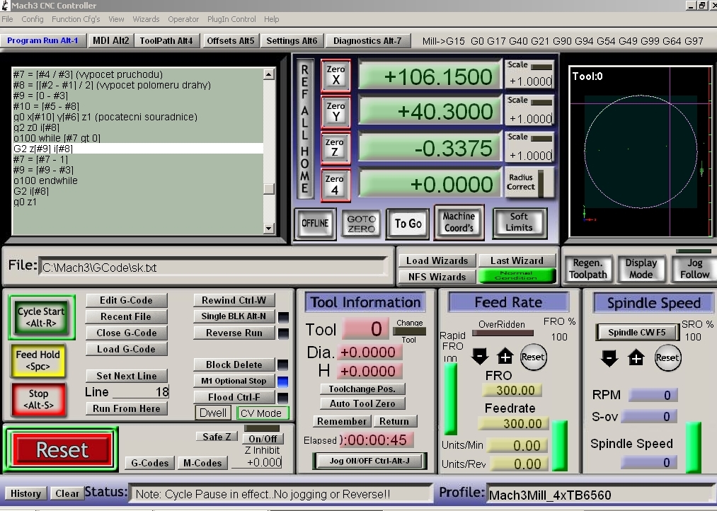 Nechci zadávat nové vlákno, řeším taky kružnici a nakopněte mě jak to zjednodušit. Tu kružnici budu dělat větší, ale to problém není. Problém vidím v tom, že to musím pořád opakovat až do docílení hloubky. A to potřebuji jet až do -30.0000 :D Nemluvím o tom, kdybych musel zajíždět i hlouběji.