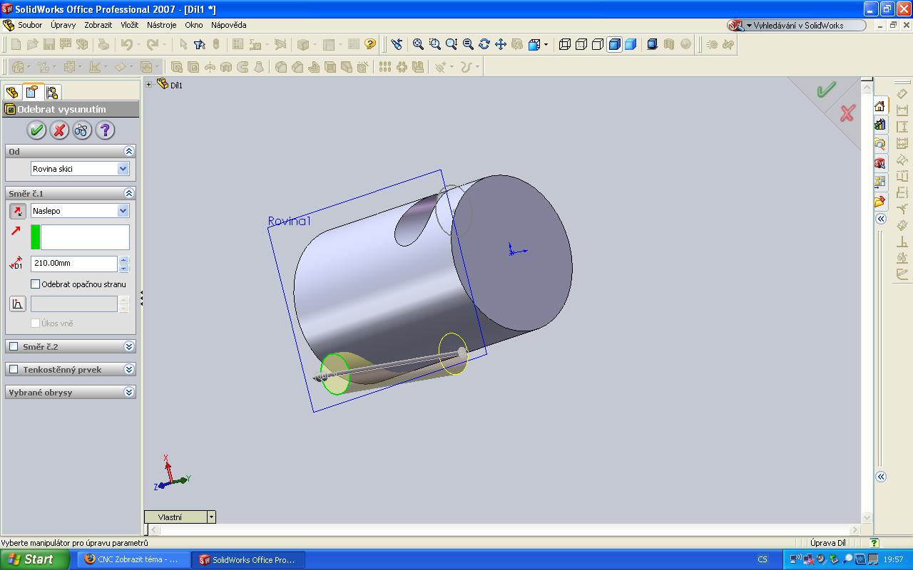 Na dno válce si skicni novou konstrukční čáru s jedním bodem a na tu čáru umístíš rovinu s nastaveným úhlem.