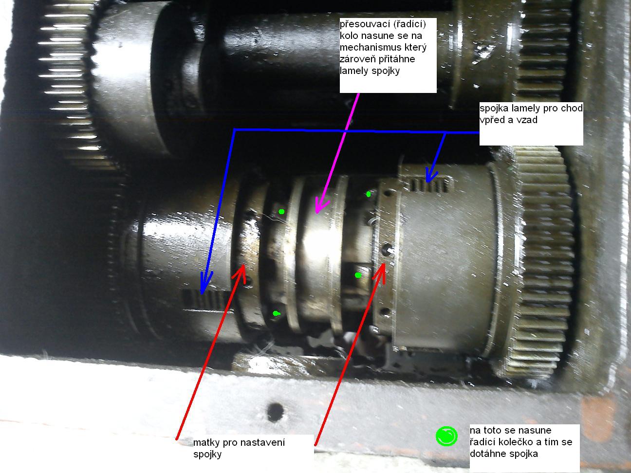 koupil jsem starý soustruh Prokop a synové, musel jsem rozdělat převodovku pohonu - je to převodovka hned za motorem na řazení otáček vpřed vzad a neutrál vývod je na řemenici na plochý řemen - bylo utržené mosazné vedení (přesouvací mechanizmus) řadícího kola, toto jsem již vyrobil z bronzu. Zdálo se, že vše funguje jak má namontoval jsem převodovku zpět, bohužel jsem při práci zjistil že se samovolně přenastavuje přítlak lamel, prosím nevíte jak toto zaaretovat v nastavené poloze?? Na jedné Fotce je ta převodovka rozdělaná s popisky na druhé je fotka již zabudované převodovky s oddělanými dvířky pro nastavení lamel - tak by to mělo jít nějak lehce zaaretovat.