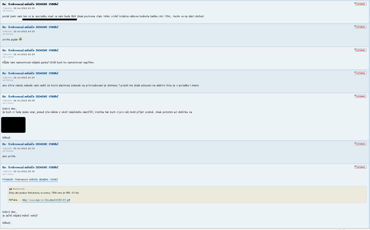 Tak od minulého týdne mám s tímto pánem zkušenost také. Rozhodně né pozitivní. Padla mi do oka jeho nabídka měniče SIEMNS 750W za 1500kč. Než jsme se dohodli, vystavil tady další nabídku těchto měničů, tentokrár za 1000kč, ale za to s prasklým krytem. Té jsem si všiml až později. V původním inzerátu ani během naší konverzace nepadlo ani slovo o žádné vadě na kráse nabízeného měniče. Měnič mi poslal poštou na dobírku za 1700,- Na této ceně jsme se dohodli. Měnič mi přišel během tří dnů. Kryt nebyl jen prasklý, ale byl dost potlučený a pohromadě drží jen silou vůle, pár úlomkůúplně chybí. Když jsem Mathewovi napsal, že jsem za svých 1500 čekal měnič bez kazu, argumetoval tím, že jsme si asi nerozuměli, a že měl za to, že mě na tuto vadu upozornil. Bohužel neupozornil. A docela mě "pobavil " tvrzením, že těch mých 1500 považoval za projev mé dobré vůle. (Omlouvám se, jestli necituju doslova, ale vyznělo to velice podobně). Žádný lepší už prý stejně nemá. Displej na měniči svítí, motor jsem k němu zatím nepřipojil. Po přečtení příspěvku od RaS pomalu ztrácím odvahu. Závěr si udělejte sami, já s tímto člověkem už příště kšeftovat nebudu.