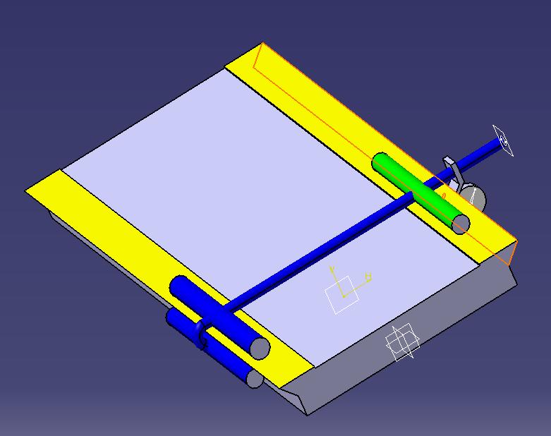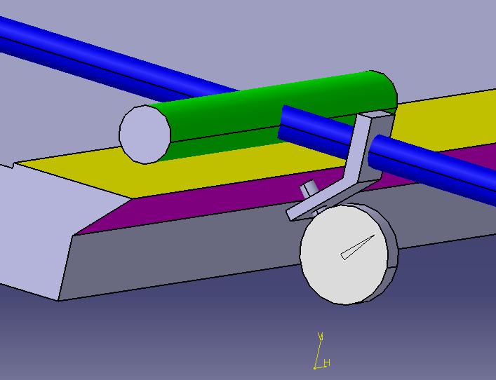 Nejprve zlute plochy do roviny nejlepe pomoci desky, ale staci i pravitko. Pak hnedou do roviny dle pravitka. Pak si zhotovime pomucku dle obrazku. .Jsou to tri kulatiny z tazenky asi prumer 25, v nich vyvrtane diry pro trmen take z tazenky asi prumer 12. Take nejak vyresime uchyceni indikatoru. Ve vsech D25 je zavit, kterym lze trmen sroubem utahnout (neni na obrazku). Posadime na rybinu, priblizne srovname, nejprve utahneme dva cepy u sebe, treti pritlacime k plose vpravo a utahneme. Nasadime indikator na fialovou plochu - to je ta dosud neopracovana- a posouvame pristroj po rybine, pritom kulatiny na leve strane musi byt stale v kontaktu s jiz oprac. plochami. Mista, kde je "kopec" si oznacime treba fixem a oskrabeme. Stale opakujeme. Obcas zkontrolujeme a zaskrabeme i podle pravitka.